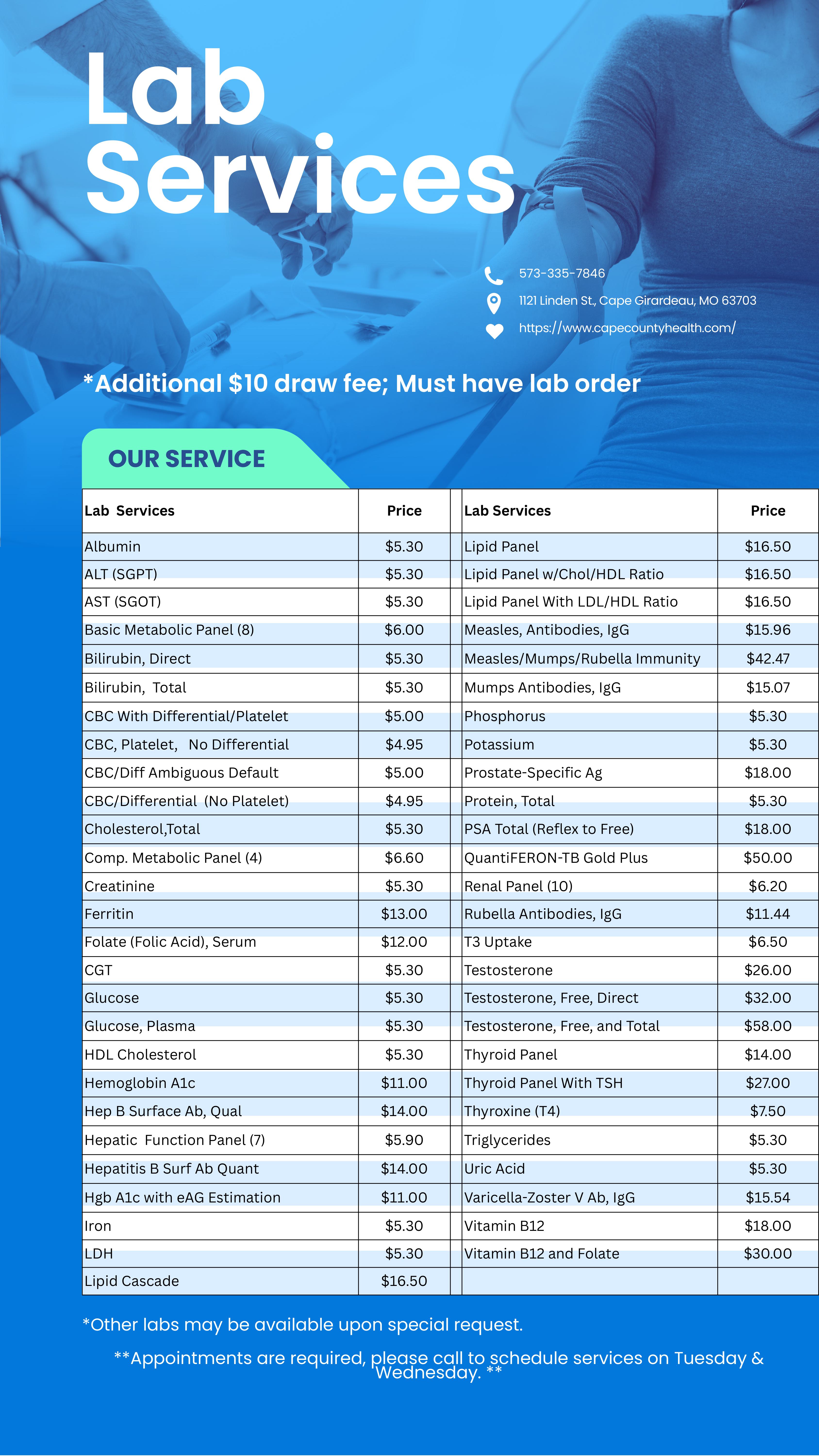We're thrilled to provide low-cost Lab Services—by appointment—on Tuesdays and Wednesdays, 8:30 am to 4:30 pm. Rest assured that the quality of our lab tests are a priority. This service offers the best value for patients who are quality-conscious shoppers for their lab test needs. We're proud to make lab services more affordable so that healthcare is accessible to more people in Cape Girardeau.